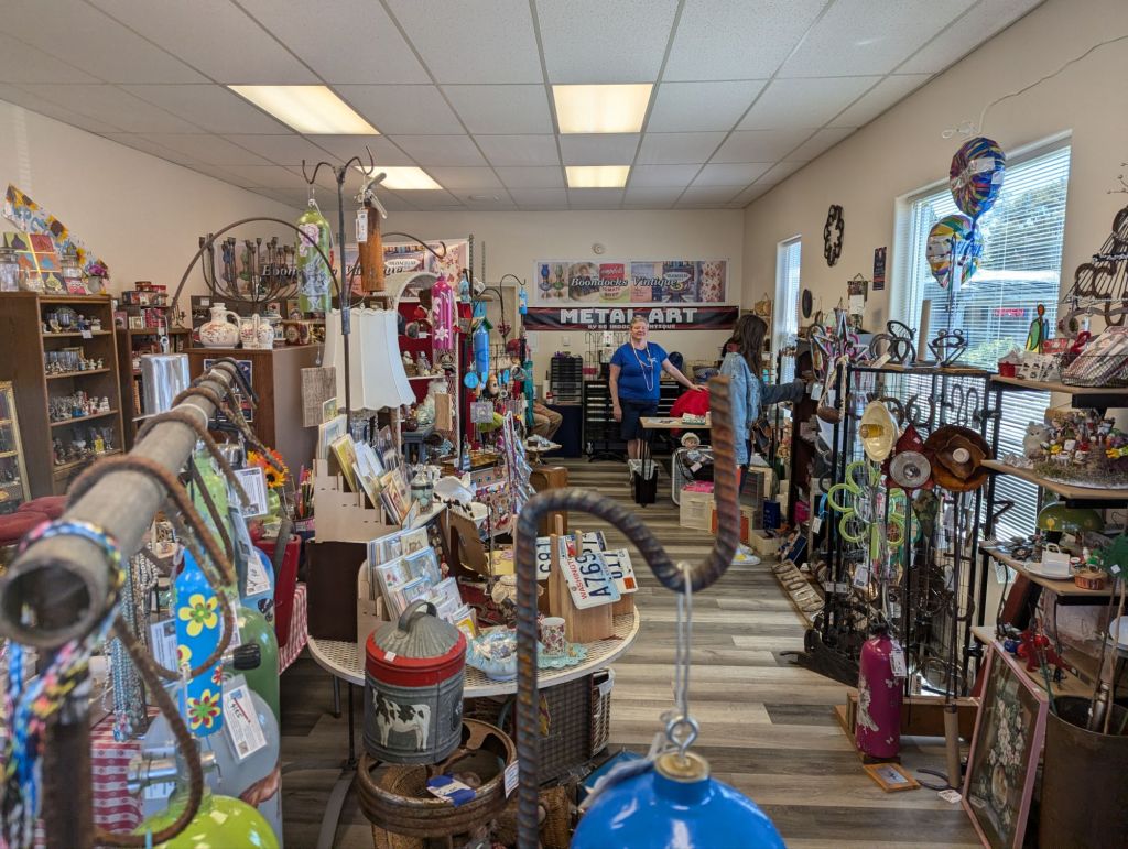 Here you will find a delightful array of gently used items, antiques, vintage collectibles, books, shoes, purses, home décor items, handcrafted pieces, and amazing metal art!